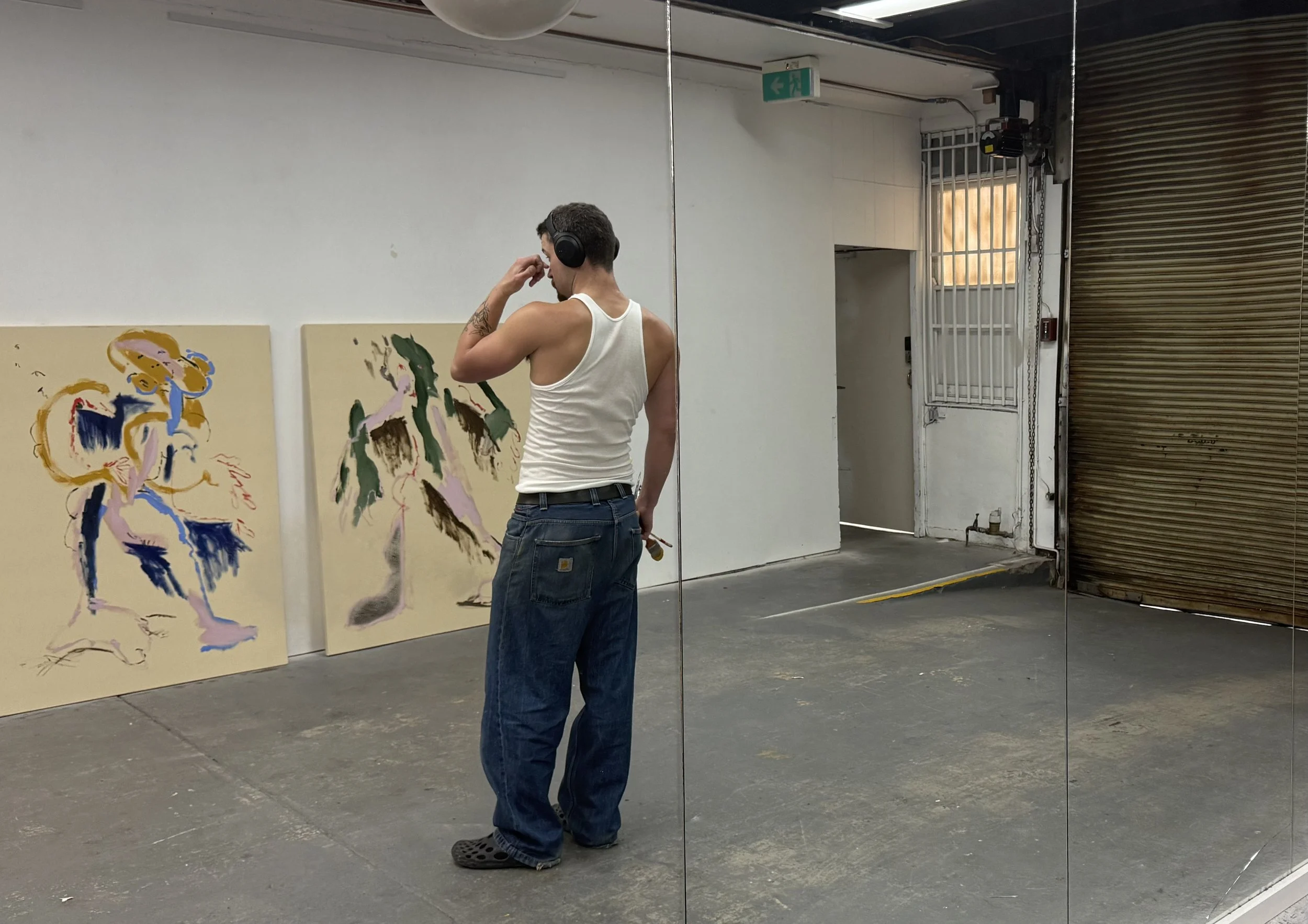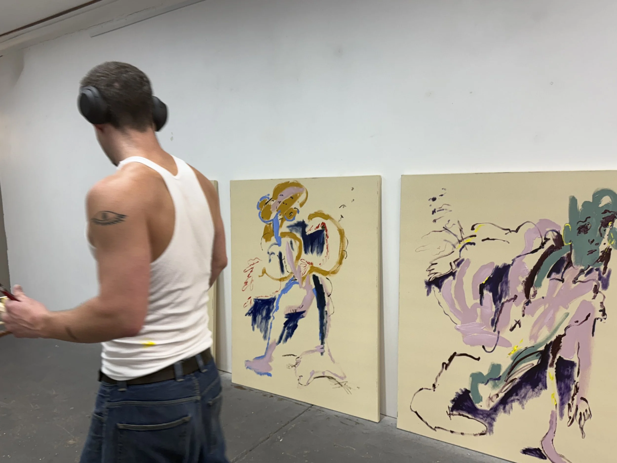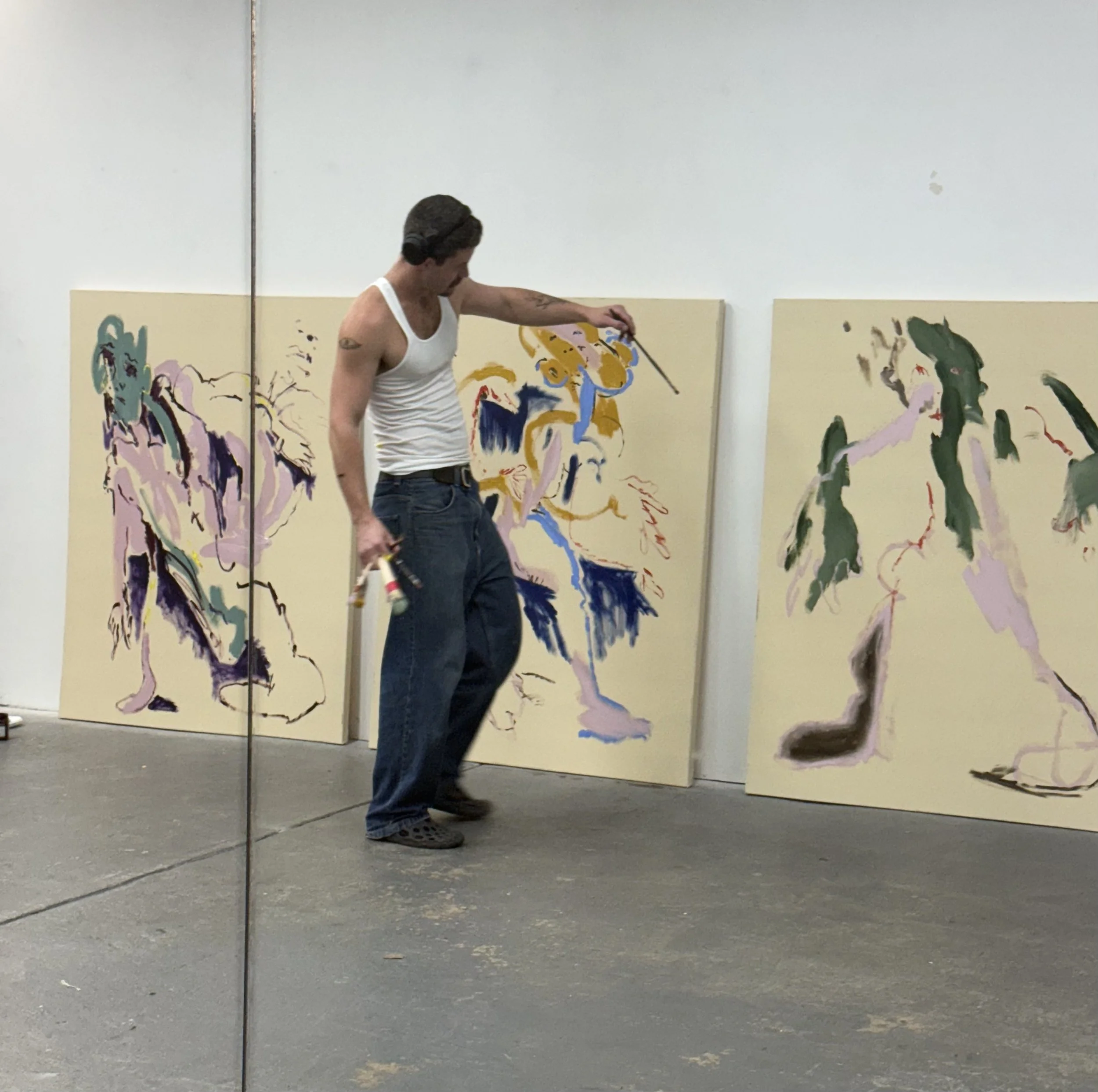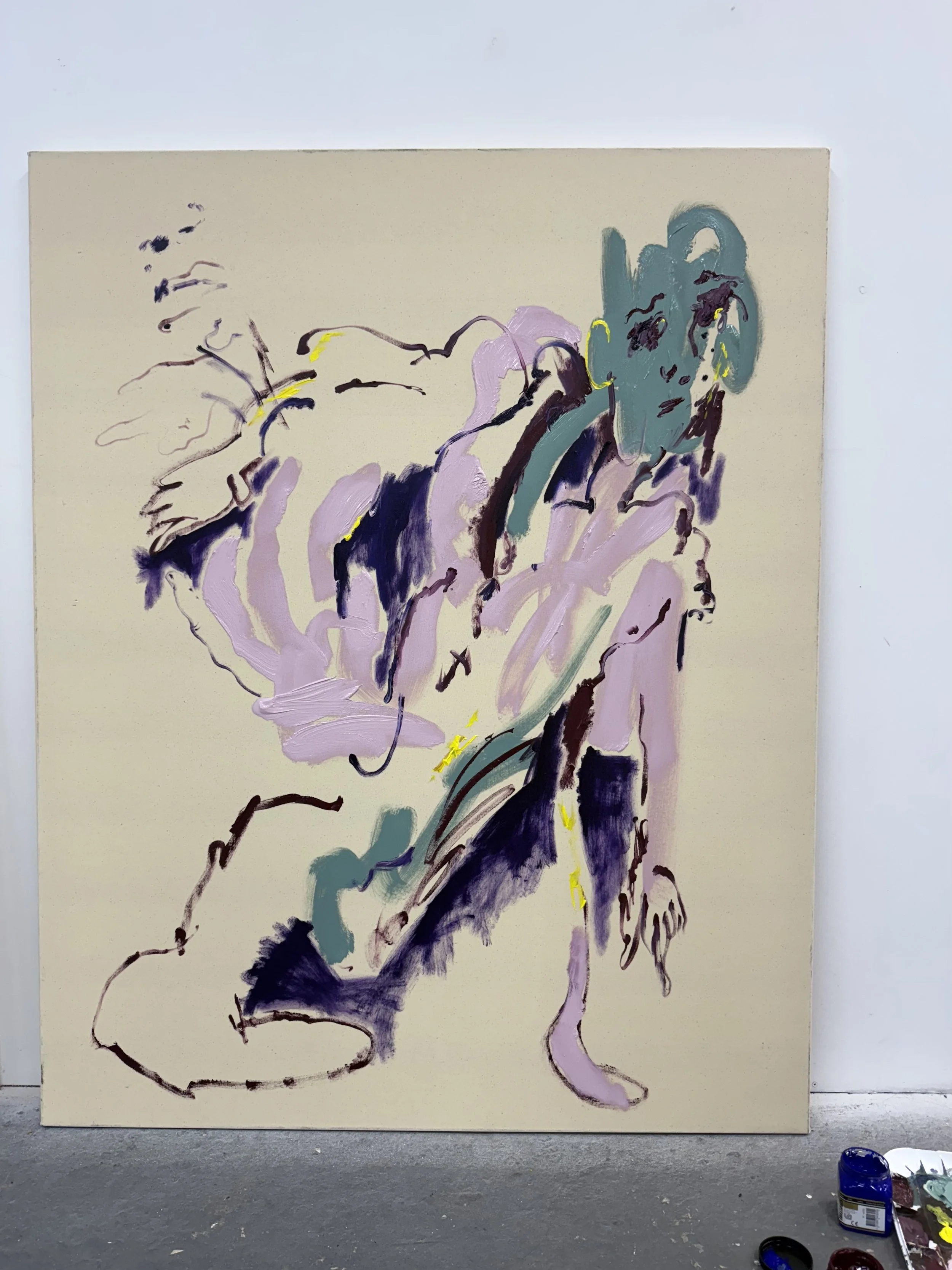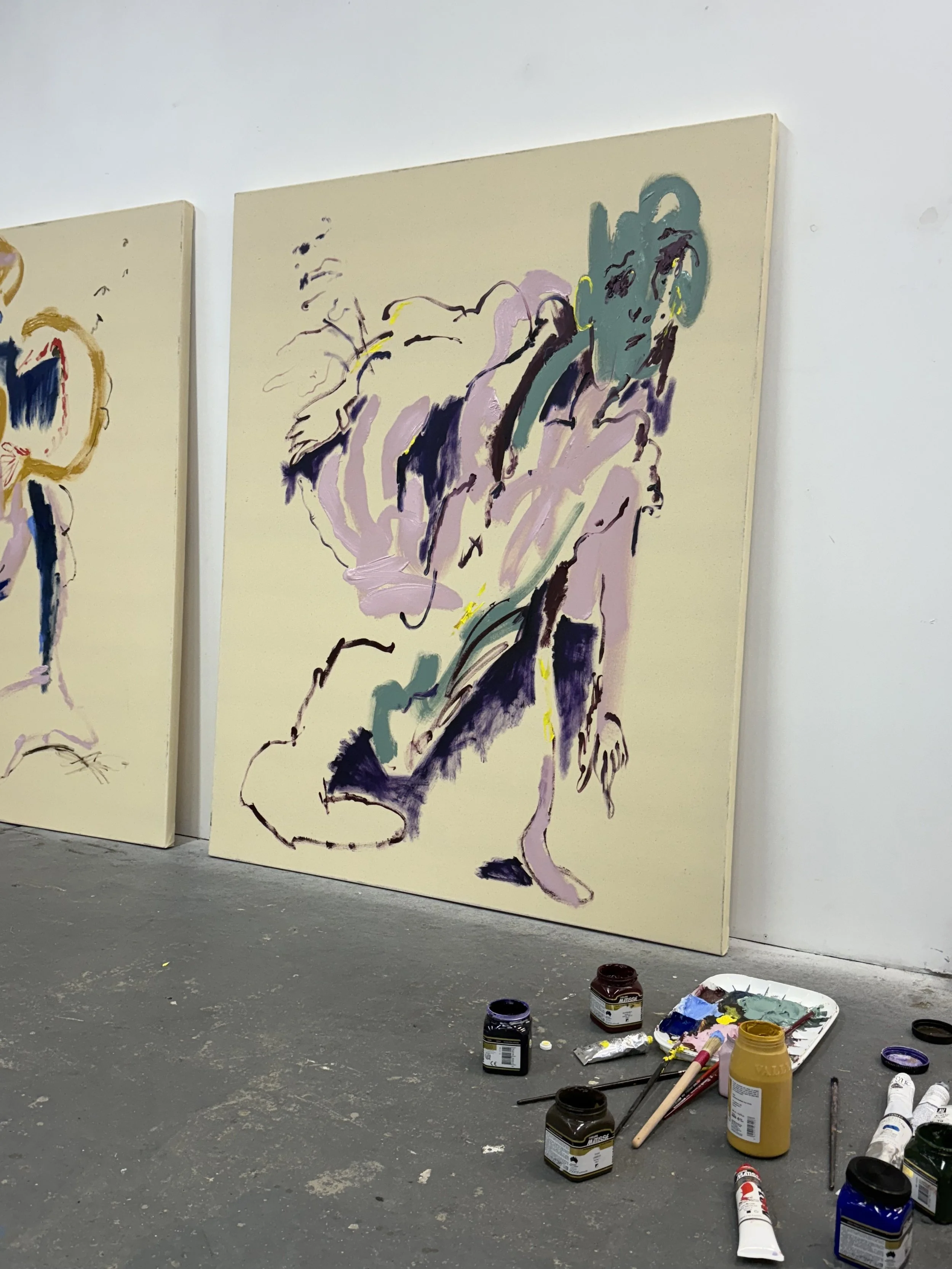 Sleeping at Night and Living With Yourself enacts a parody of coherence in the same way that selfishness parodies philosophy. Just as Epicureanism is misremembered as a licence for indulgence rather than a pursuit of balance. The painted figures appear to collapse under the weight of their own desires. Limbs are elongated into grotesque extensions, torsos sag into caricature, and expressions hover between anguish and satire - suggesting that pleasure, when pursued without limit, dismantles rather than completes the self.