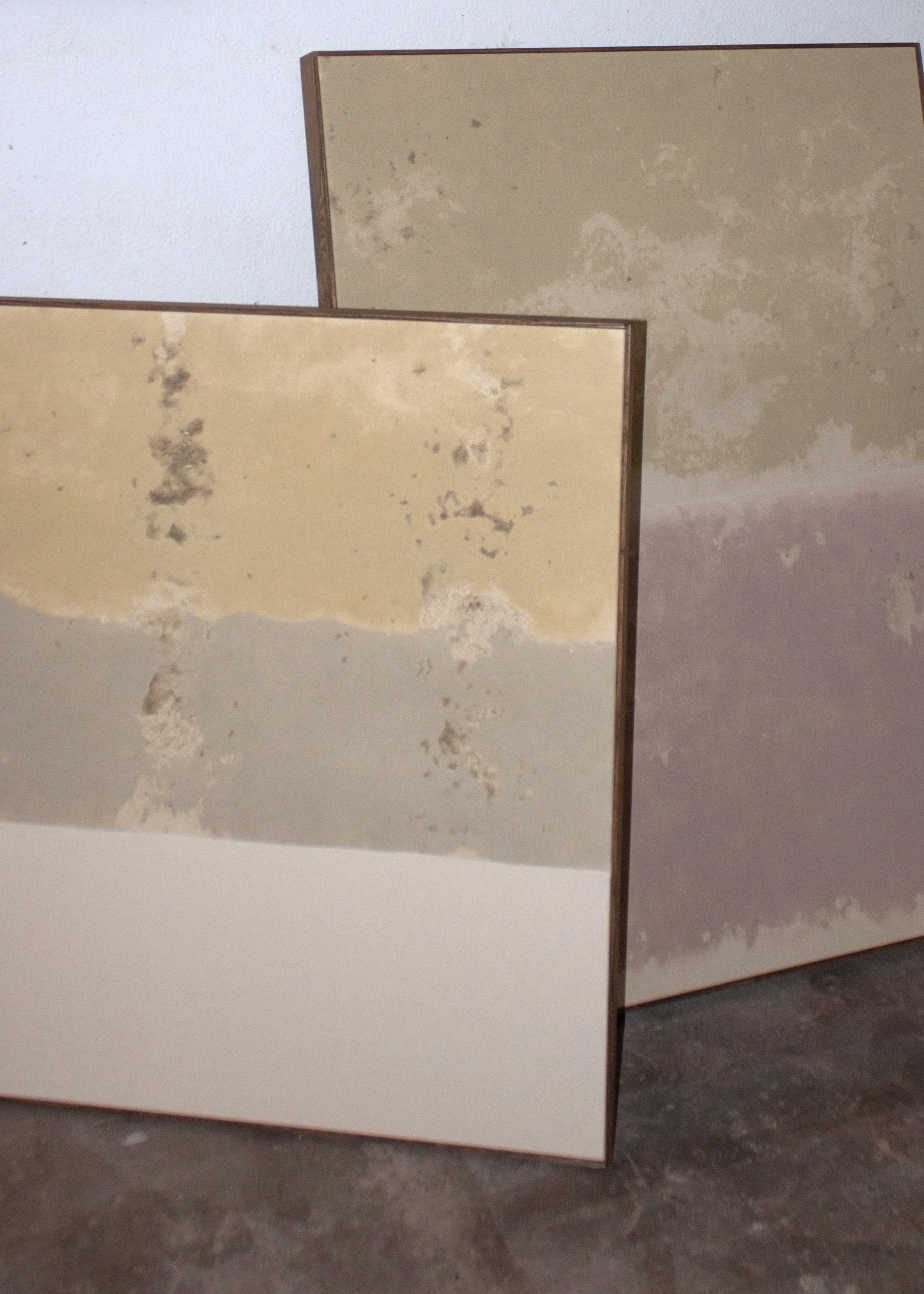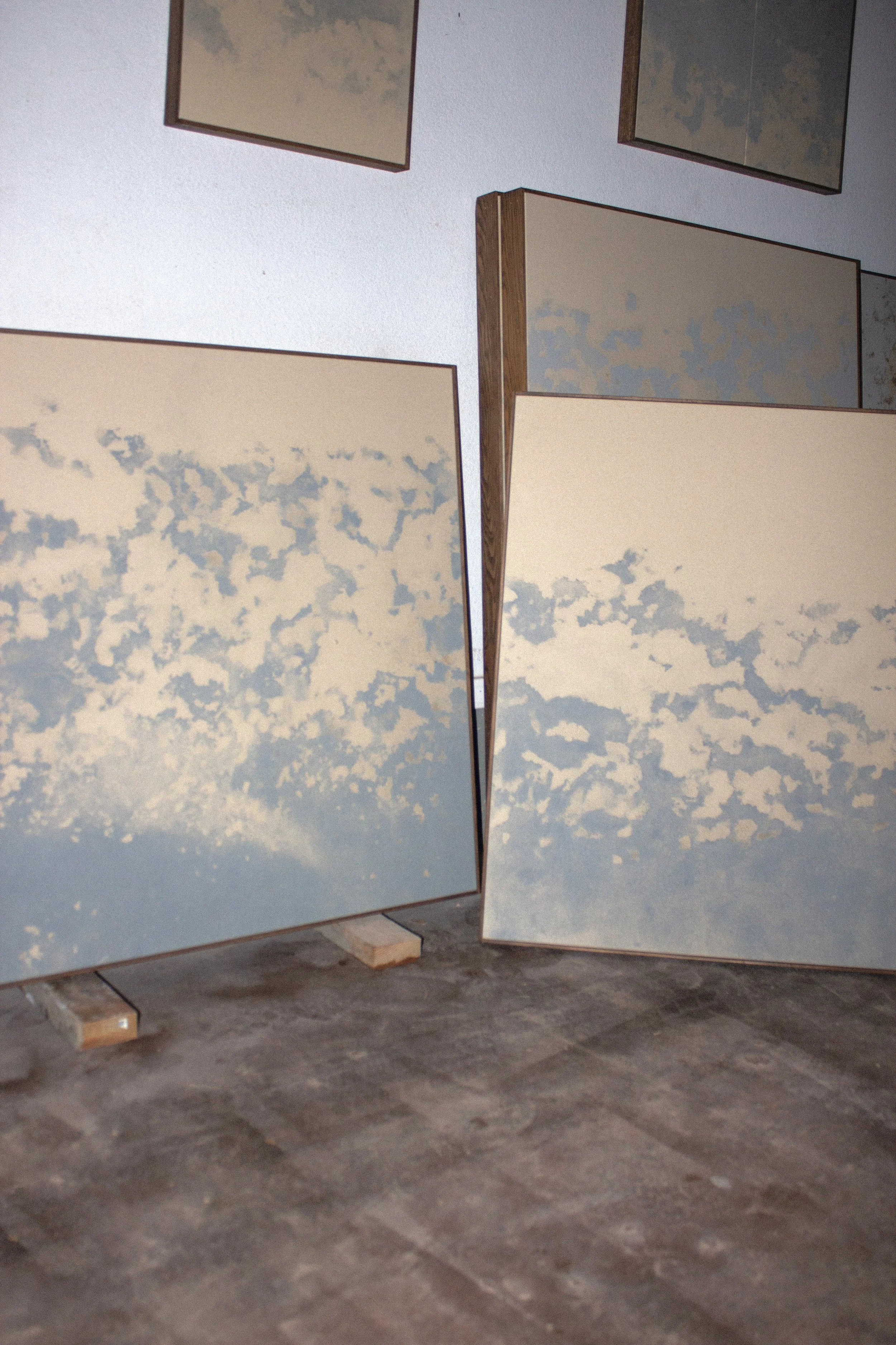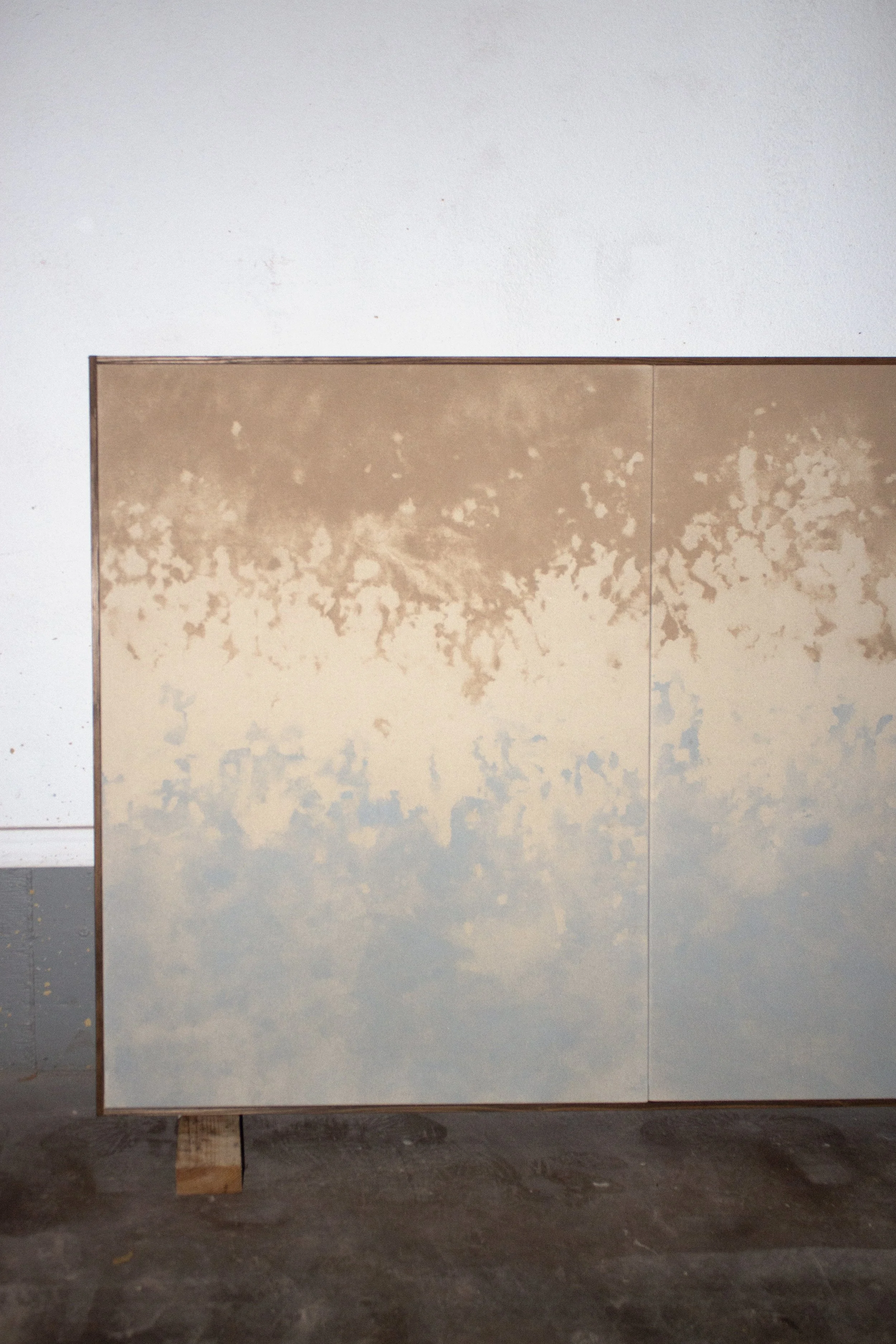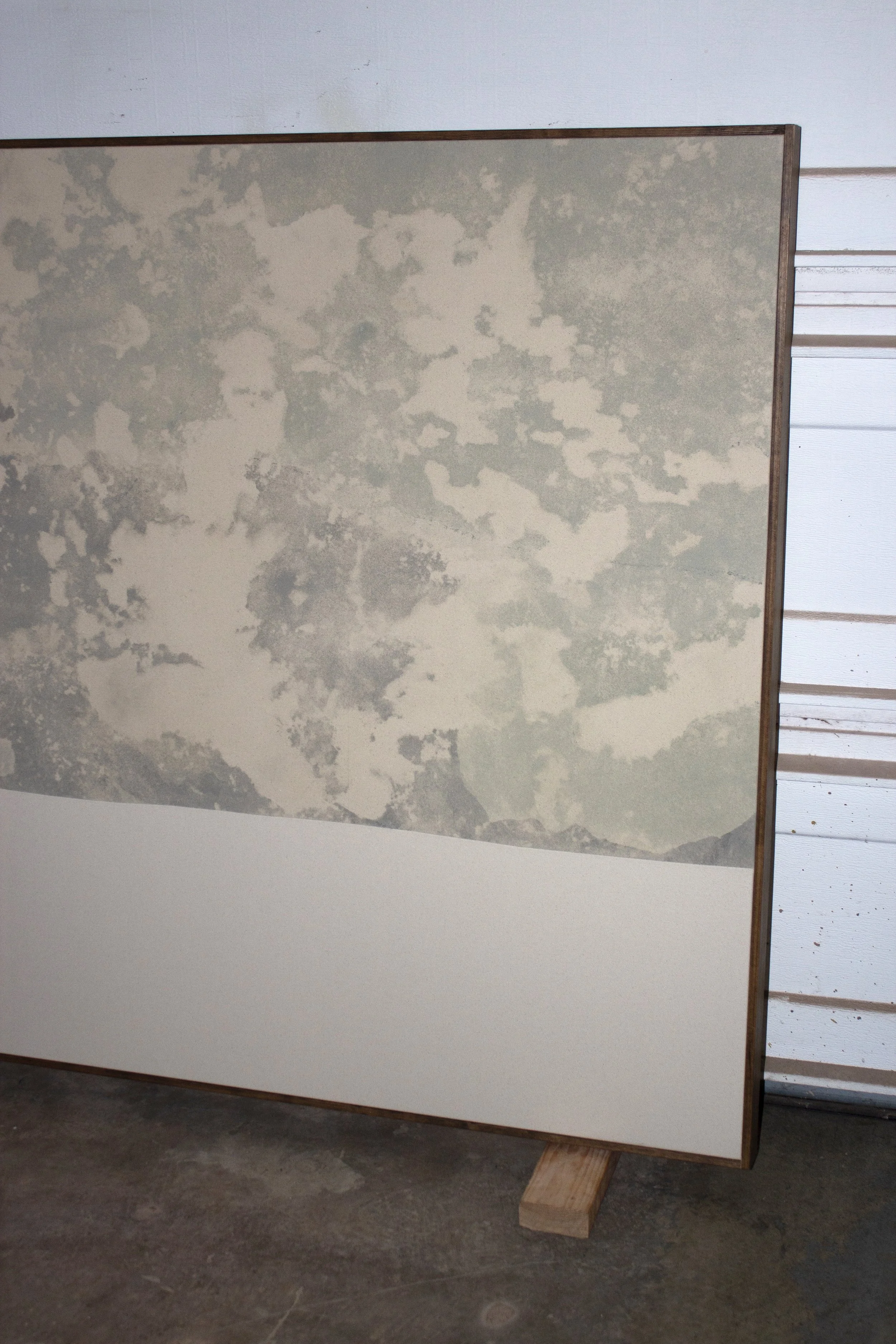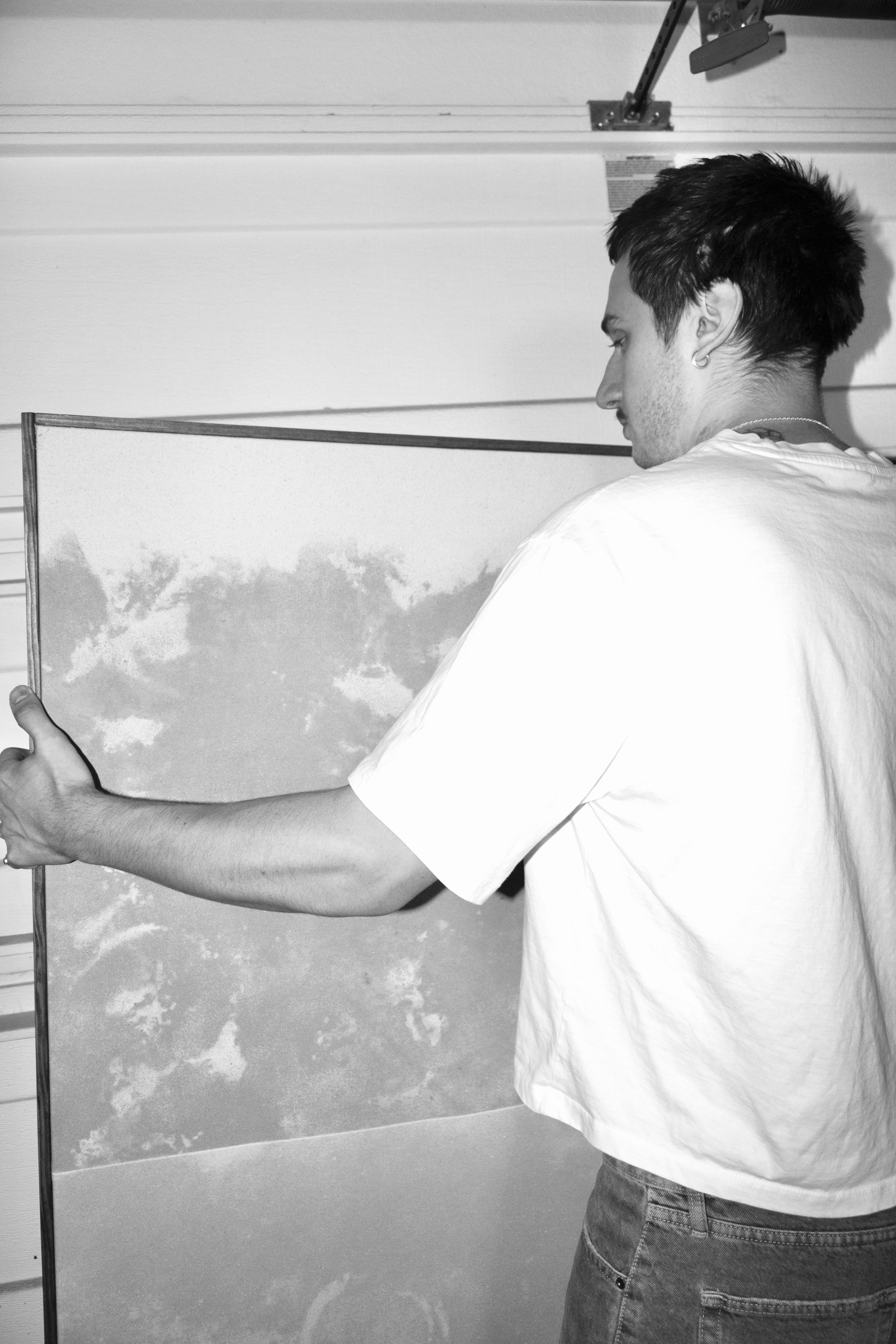 Viktor Kobylianski (b. 1995) is a Ukrainian-born artist based in the United States. He works with materials commonly associated with construction, including mineral dust, cement slurries, pigments, and sand applied to raw fabric, with the image formed through imprinted residue after removal. His practice is process-driven and subtractive. Applied directly by hand, he establishes conditions in which the materials cure, settle, and imprint, allowing their behavior to determine the final residue embedded within the surface. Individual surfaces are often stitched together, assembling separate fragments into a single work. Removed from their functional role, these materials shift from utility to memory. Positioned between object and surface, presence and absence, the work invites slow looking and operates as a physical record rather than an image.