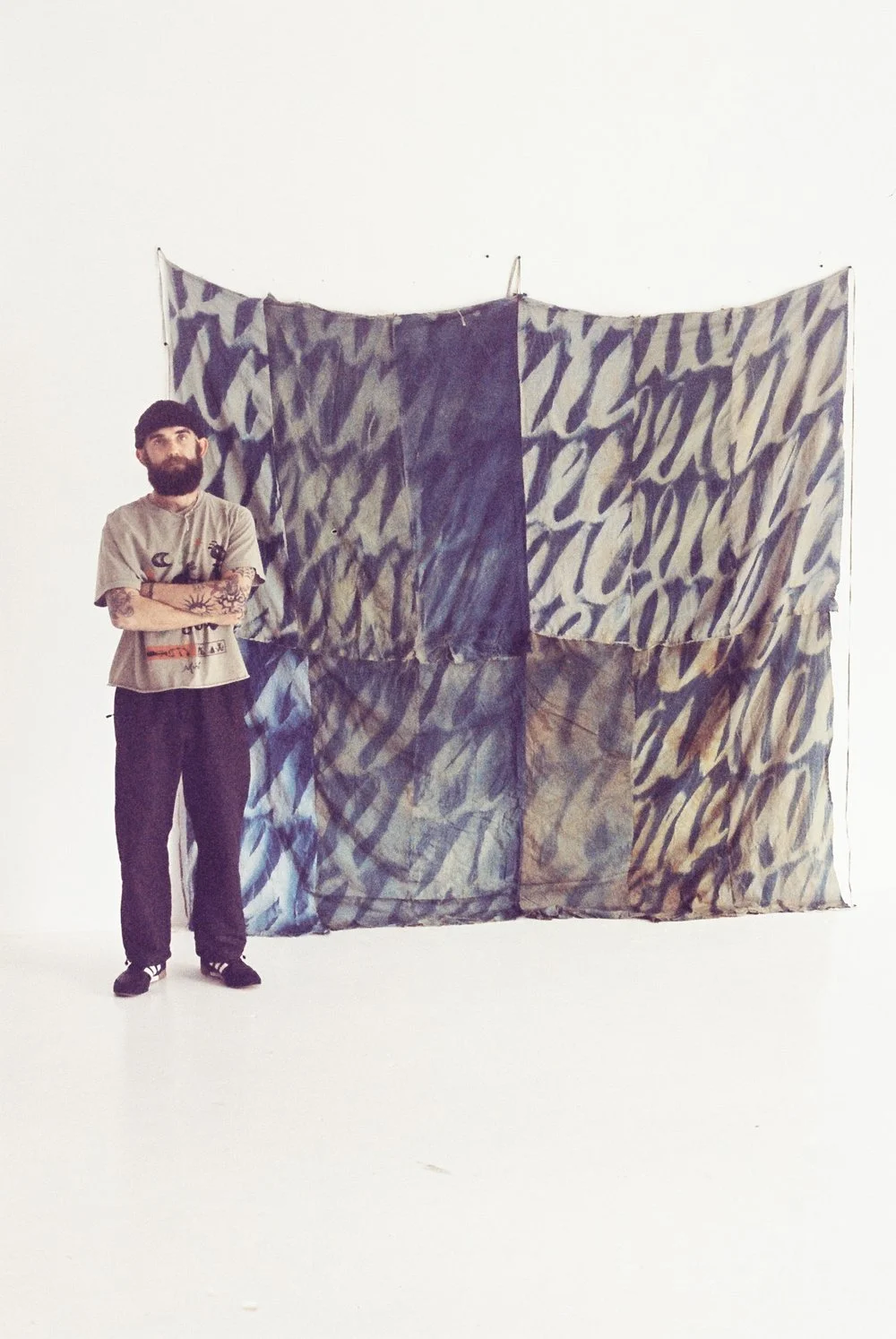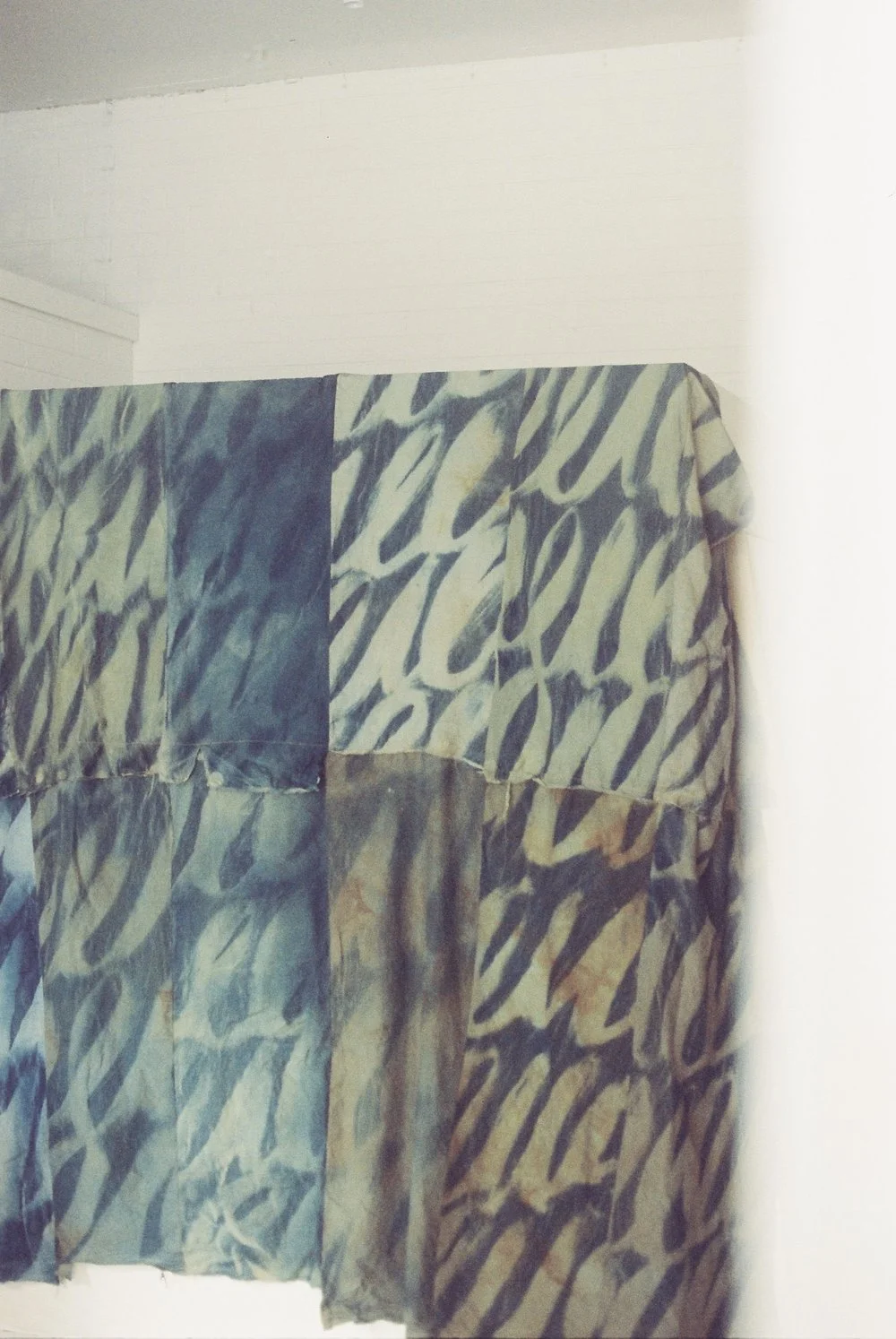 Emily Ebbs - ‘The pieces made for Incu in collaboration with Thread Together were motivated by the theme of resourcefulness and mindfulness. The Materials used in the two artworks are all reused fabrics that came from Threads Together, bed sheets from op shops or left over fabrics from textile projects. The slow and therapeutic process of staining the fabrics with multiple layers of watered down acrylic or turmeric dye aid in the idea of slowing down production in the fashion industry.’